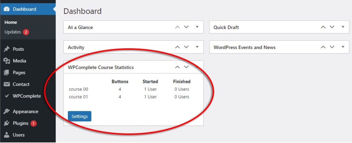 Note: To disable this widget, go to WPComplete > Settings and uncheck “Show Statistics Widget on Dashboard.”